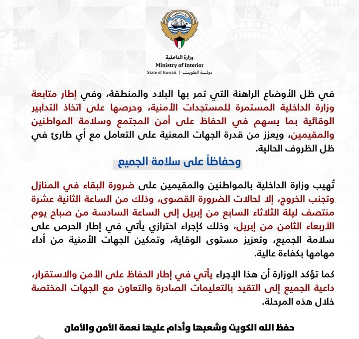 أهابت وزارة الداخلية الكويتية بالمواطنين والمقيمين بضرورة البقاء في المنازل وتجنب الخروج إلا لحالات ...