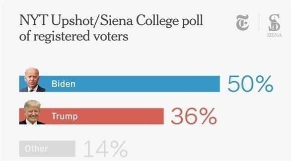 في واحدة من أسوأ نتائج ترامب في استطلاع الرأي لسباق 2020 الرئاسي، حصل الديمقراطي بايدن على 50% من الأصوات مقابل 36% للرئيس، حسب ما أظهر مسح أجرته صحيفة نيويورك تايمز ومعهد سيينا.