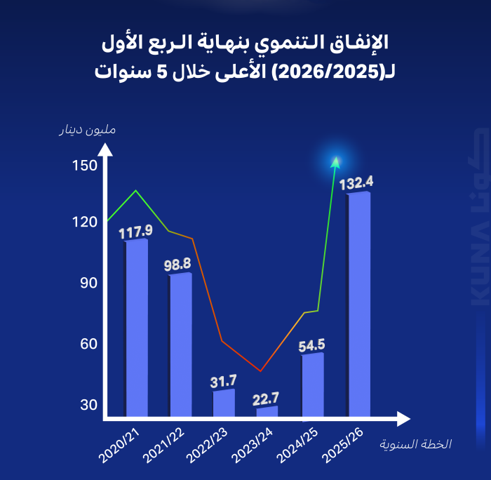 سجلت دولة الكويت بنهاية الربع الأول من خطة التنمية (2025 - 2026) أعلى معدل إنفاق تنموي ربع سنوي خلال السنوات الخمس الماضية بما يعكس التوجهات الحكومية المتسارعة نحو تنفيذ المشروعات الرأسمالية ودفع عجلة التنمية في البلاد.