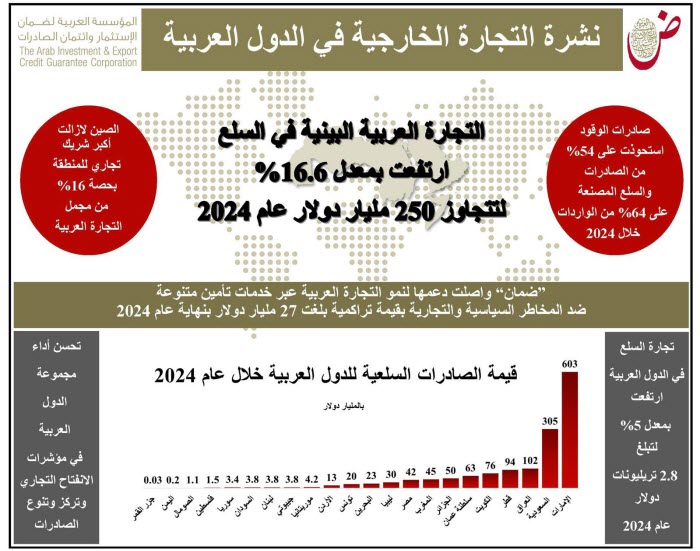 كشفت المؤسسة العربية لضمان الاستثمار وائتمان الصادرات (ضمان) عن ارتفاع قيمة التجارة العربية في السلع والخدمات بمعدل %4.5 لتتجاوز 3.6 تريليونات دولار خلال عام 2024، كمحصلة لارتفاع الصادرات بمعدل 1.7 % لتبلغ 1.9 تريليون دولار، والواردات بمعدل 7.8 % إلى أكثر من 1.7 تريليون دولار.