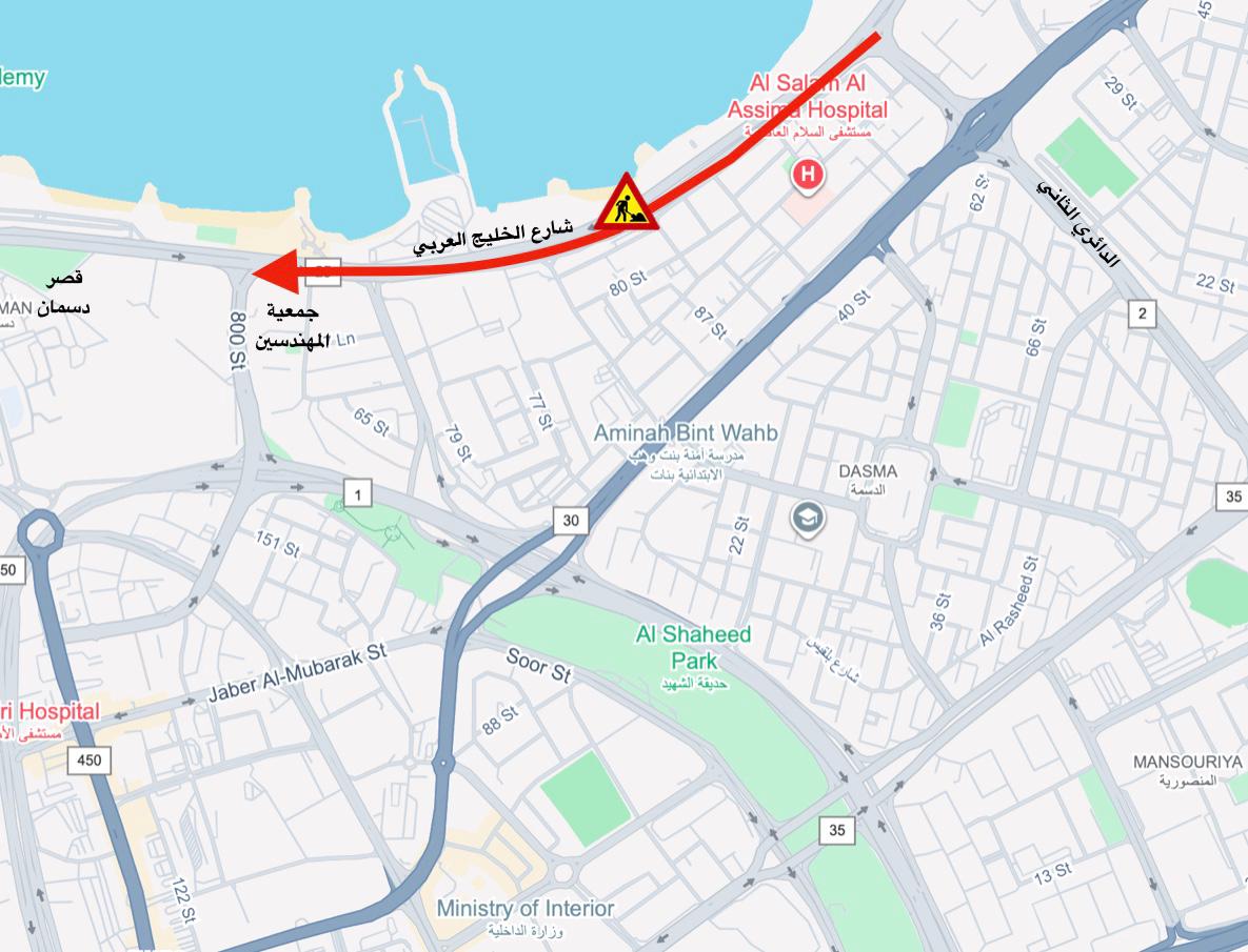 أعلنت الإدارة العامة للمرور عن إغلاق كلي لشارع الخليج العربي من تقاطع الدائري الثاني وصولا إلى تقاطع جمعية المهندسين الكويتية اعتبارا من الساعة السادسة مساء أمس الخميس حتى الساعة السادسة من صباح يوم الأحد المقبل.