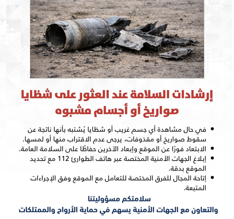 أعلنت وزارة الداخلية عن 4 إرشادات للسلامة عند العثور على شظايا صواريخ أو أجسام مشبوهة وهي: في حال مشاهدة أي جسم غريب أو شظايا يُشتبه بأنها ناتجة عن سقوط صواريخ أو مقذوفات، يرجى عدم الاقتراب منها أو لمسها ، الابتعاد فورًا عن الموقع وإبعاد الآخرين حفاظًا على السلامة العامة، إبلاغ الجهات الأمنية المختصة عبر هاتف الطوارئ 112 مع تحديد الموقع بدقة، إتاحة المجال للفرق المختصة للتعامل مع الموقع وفق الإجراءات المتبعة.