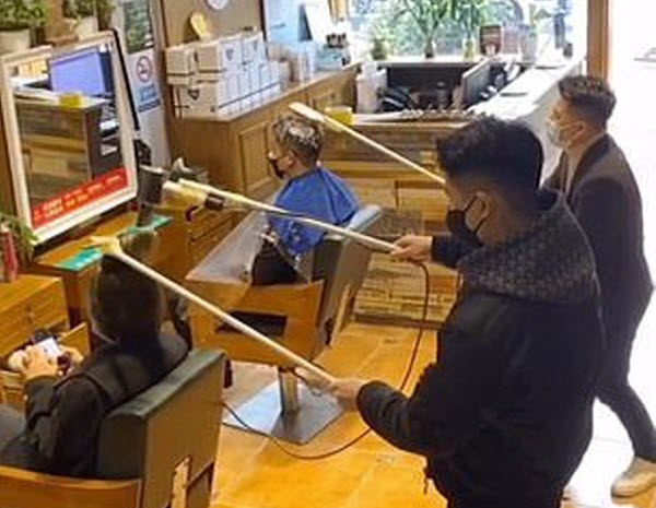 توصل الحلاقون الصينيون إلى طريقة مبتكرة لتصفيف شعر زبائنهم مع الحفاظ على مسافة آمنة بين الاثنين، وسط تفشي فيروس كورونا، وذلك باستخدام أدوات حلاقة متصلة بنهاية العصي الطويلة.وأظهر مقطع فيديو متداول مصففي الشعر وهم يرتدون أقنعة واقية ويمسكون بعصي طولها أربعة أقدام ملفوفة بالفرشاة وآلات الحلاقة ومجففات الشعر.