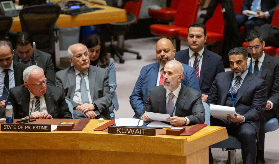 ختاما تدعو دولة الكويت مجدداً هذا المجلس إلى ضرورة تحمل مسؤولياته وتوفير الحماية الدولية للشعب الفلسطيني، وتناشد المجتمع الدولي بضرورة دعم ثبات الشعب الفلسطيني على أرضه والتحذير من أي محاولات لتهجيره ومفاقمة قضية اللاجئين الذين يجب تلبية حقهم فمرور الزمن وموجات التهجير القسري لا يمكن أن تحرِم الشعب الفلسطيني الشقيق من حقه في العودة إلى وطنه.