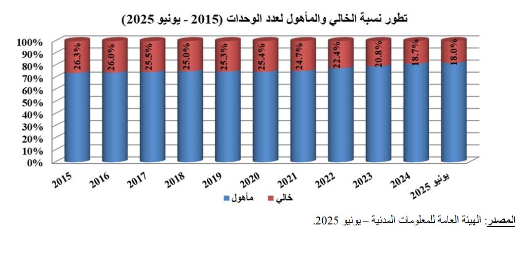 وطبقاً لإحصائيات الهيئة العامة للمعلومات المدنية، تشكل الشقق المكون الأكبر من عدد الوحدات، إذ بلغت ما نسبته 44.9 % من الإجمالي، تلتها المنازل بنسبة 22.1 %، ثم الدكاكين بنسبة 20.2 %. وبلغ معدل النمو المركب (يونيو 2015 – يونيو 2025) للدكاكين والمنازل والشقق، نحو 3.2 %، 1.6 % و1.5 % على التوالي، بينما انخفض معدل النمو المركب للملاحق بنحو -1.5 %. وتراجعت نسبة الخالي من الوحدات وفقاً لتقديرات الهيئة العامة للمعلومات المدنية، في يونيو 2025 إلى نحو 18.0 % مقارنة بنحو 20.1 % في نهاية يونيو 2024. ويظهر الرسم البياني التالي نسبة الخالي والمشغول خلال السنوات 2015 - يونيو 2025.