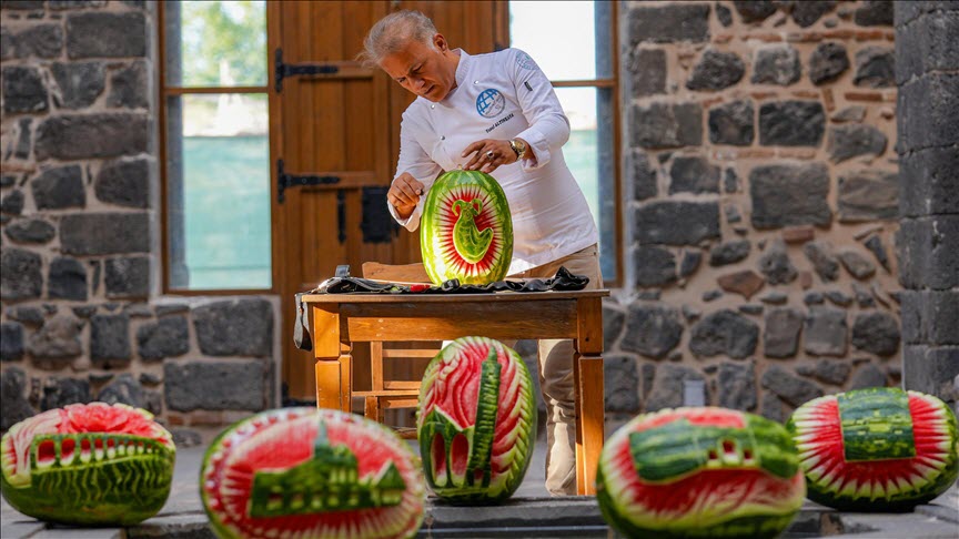 يحول الشيف التركي يوسف ألطنقايا بمهارته وباستخدام سكاكين خاصة البطيخ إلى لوحات فنية تجسد أبرز معالم مدينة ديار بكر التاريخية.