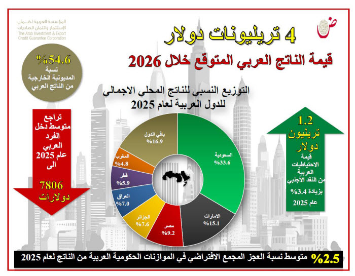 توقعت المؤسسة العربية لضمان الاستثمار وائتمان الصادرات ارتفاع قيمة الناتج المحلي الإجمالي العربي بمعدل 6ر5 بالمئة لتبلغ نحو 4 تريليونات دولار عام 2026 بدفع من النمو المرجح في الناتج المحلي في 19 دولة عربية منها 8 اقتصادات نفطية تساهم وحدها بأكثر من 70 في المئة من الناتج العربي الإجمالي.