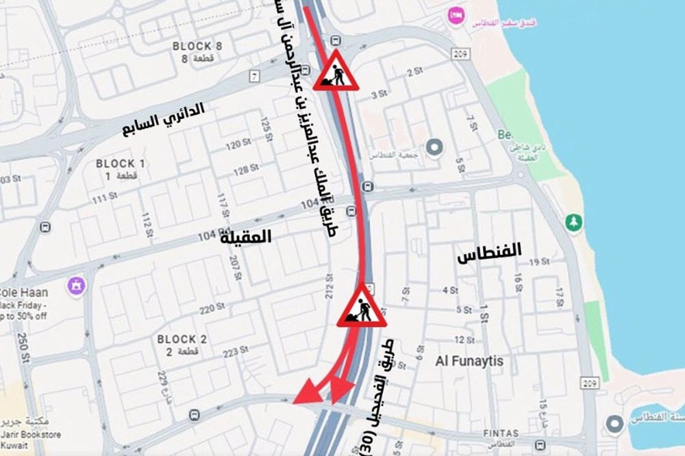 أعلنت الإدارة العامة للمرور عن إغلاق الحارة اليمنى والحارة الوسطى مع إغلاق تقاطع العقيلة والفنطاس، على طريق الملك عبد العزيز بن عبد الرحمن آل سعود «طريق الفحيحيل» للقادم من مدينة الكويت باتجاه الفحيحيل، وذلك اعتباراً من امس الإثنين الموافق 2025/12/8 وحتى يوم الثلاثاء الموافق 2025/12/23.