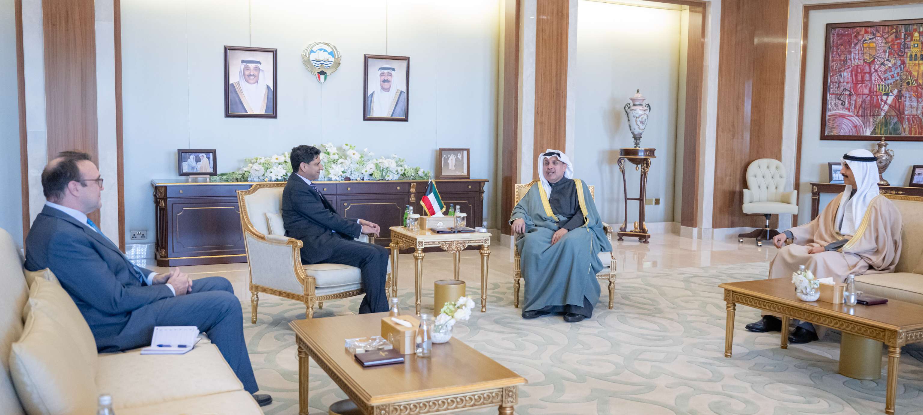 استقبل وزير شؤون الديوان الأميري الشيخ حمد جابر العلي الصباح ومعالي رئيس ديوان سمو ولي العهد الشيخ ثامر جابر الأحمد الصباح بقصر بيان صباح اليوم سعادة سفير المملكة المتحدة لبريطانيا العظمى وأيرلندا الشمالية الصديقة لدى دولة الكويت قدسي رشيد.