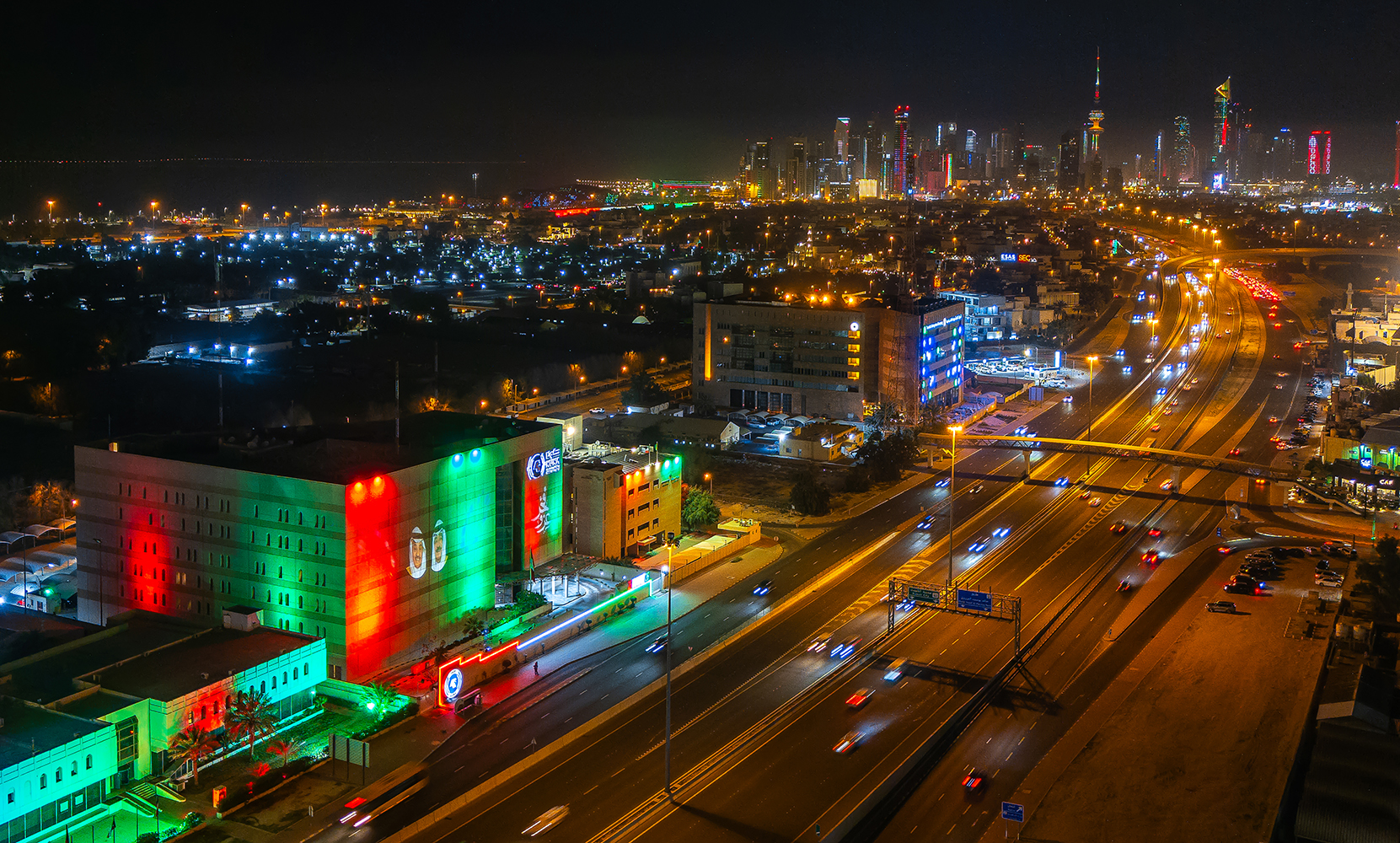 فما بين أبراج الكويت الشامخة المتكئة على شاطئ الخليج العربي ومدينة الكويت العاصمة بتراثها وحداثتها تنعكس الأضواء بألوان العلم على المباني ليتهادى اللونان الأخضر والأحمر على الواجهات فيما يتعانق الأبيض والأسود في مشهد يفيض اعتزازا مجسدا معاني الوفاء والانتماء.