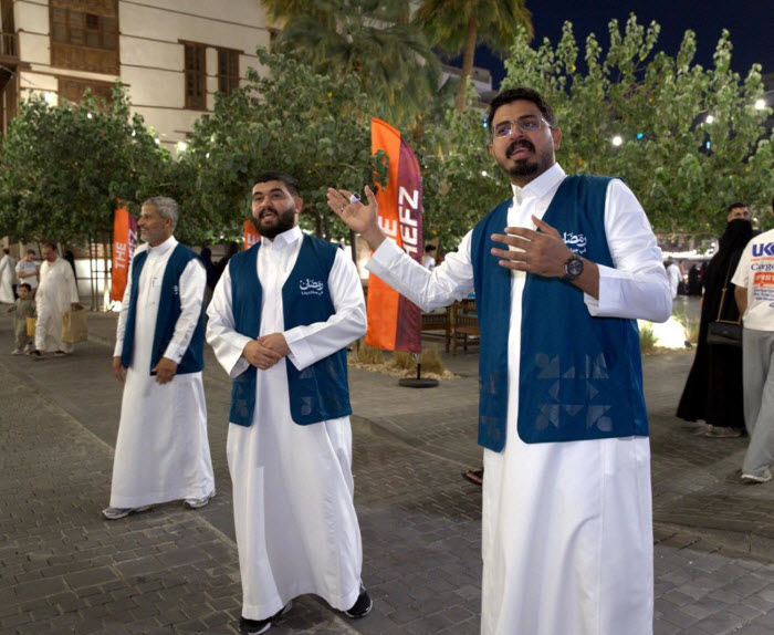وتشهد ساحات ومسارات جدة التاريخية انتشاراً واسعاً للشباب والفتيات المشاركين في الفعاليات، الذين يرتدون الأزياء الحجازية التقليدية، ويتولى هؤلاء الشباب مهمة استقبال الزوار بالأهازيج والترديدات الفلكلورية القديمة التي كانت تُميز أهالي حارات جدة قديماً عند استقبال ضيوفهم، ممزوجة بعبارات الترحيب الدافئة والدعوات الصادقة، مما يضفي على الأجواء الرمضانية طابعاً استثنائياً يجمع الروحانية والبهجة.