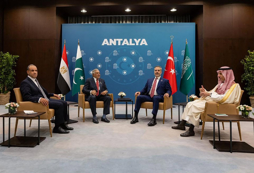 وعقد وزير الخارجية التركي ونظراؤه السعودي فيصل بن فرحان، والمصري بدر عبد العاطي، والباكستاني محمد إسحاق دار، اجتماعاً مساء الجمعة، على هامش الدورة الخامسة لـمنتدى أنطاليا الدبلوماسي، لبحث سبل إيجاد حلول للمشكلات الإقليمية، وفي مقدمتها الحرب بين الولايات المتحدة وإسرائيل وإيران، في إطار مبدأ الملكية الإقليمية الذي يقوم على مساعي حل مشكلات المنطقة من دون تدخل أجنبي.