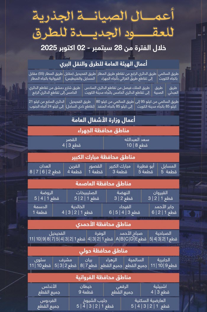 من جهة أخرى كشف مركز التواصل الحكومي لدولة الكويت، امس عن أعمال الصيانة الجذرية للعقود الجديدة للطرق للفترة من 28 سبتمبر الحالي وحتى 2 أكتوبر 2025.